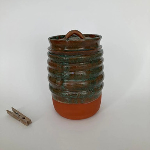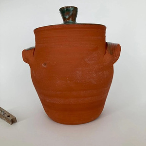 2022Eerste dekselpot uit een serie van vier op de draaischijf gedraaide dekselpotten; rode scherf gestookt met eigen ontwikkeld glazuur op 1150 ºC.